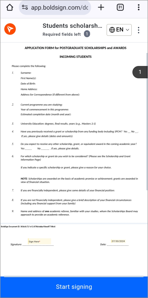 Managing financial aid and scholarship applications involves handling numerous forms, documents, and approvals, which can be both time-consuming and error-prone. BoldSign offers an efficient solution with its electronic signature and document management capabilities. By streamlining applications, verifying documents electronically, and ensuring secure storage, BoldSign simplifies the entire process for students, parents, and administrators.