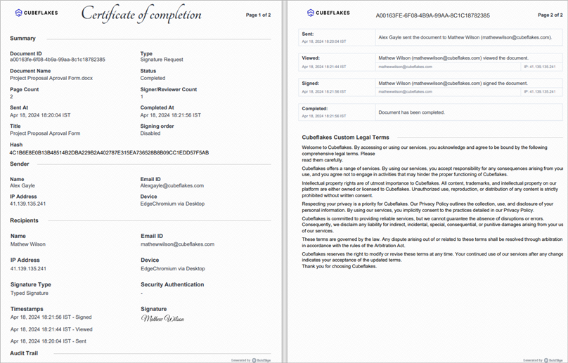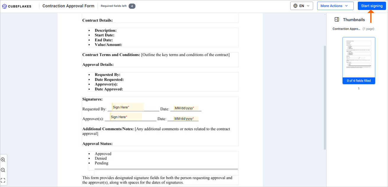 - Review and Sign: Stakeholders can review, sign, or request changes directly within the platform, which accelerates the approval process. You can refer to this article on how to sign a document in BoldSign.