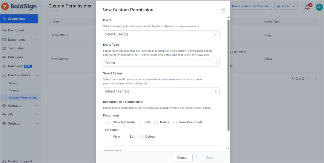 - Role-Based Permissions: BoldSign allows project leads to set custom permissions for sensitive documents like financial disclosures.