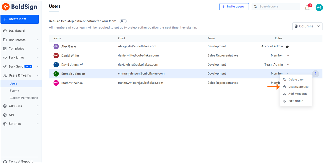 - Log into BoldSign, navigate to the Users & Teams menu, and select Teams.