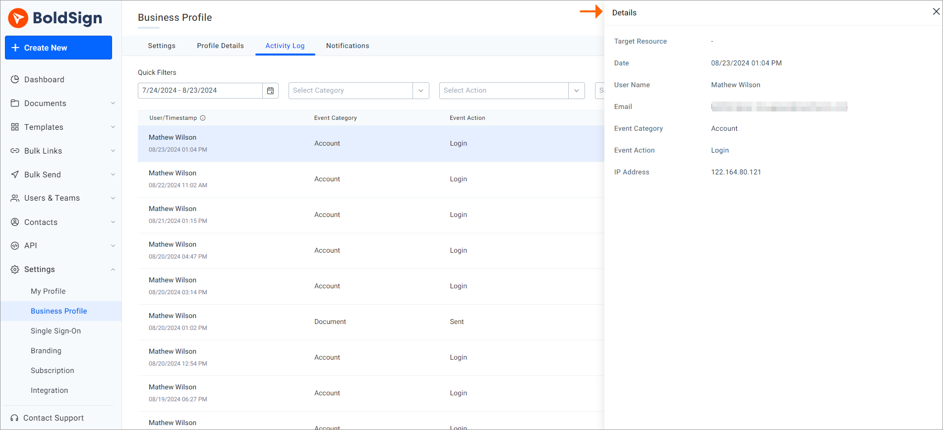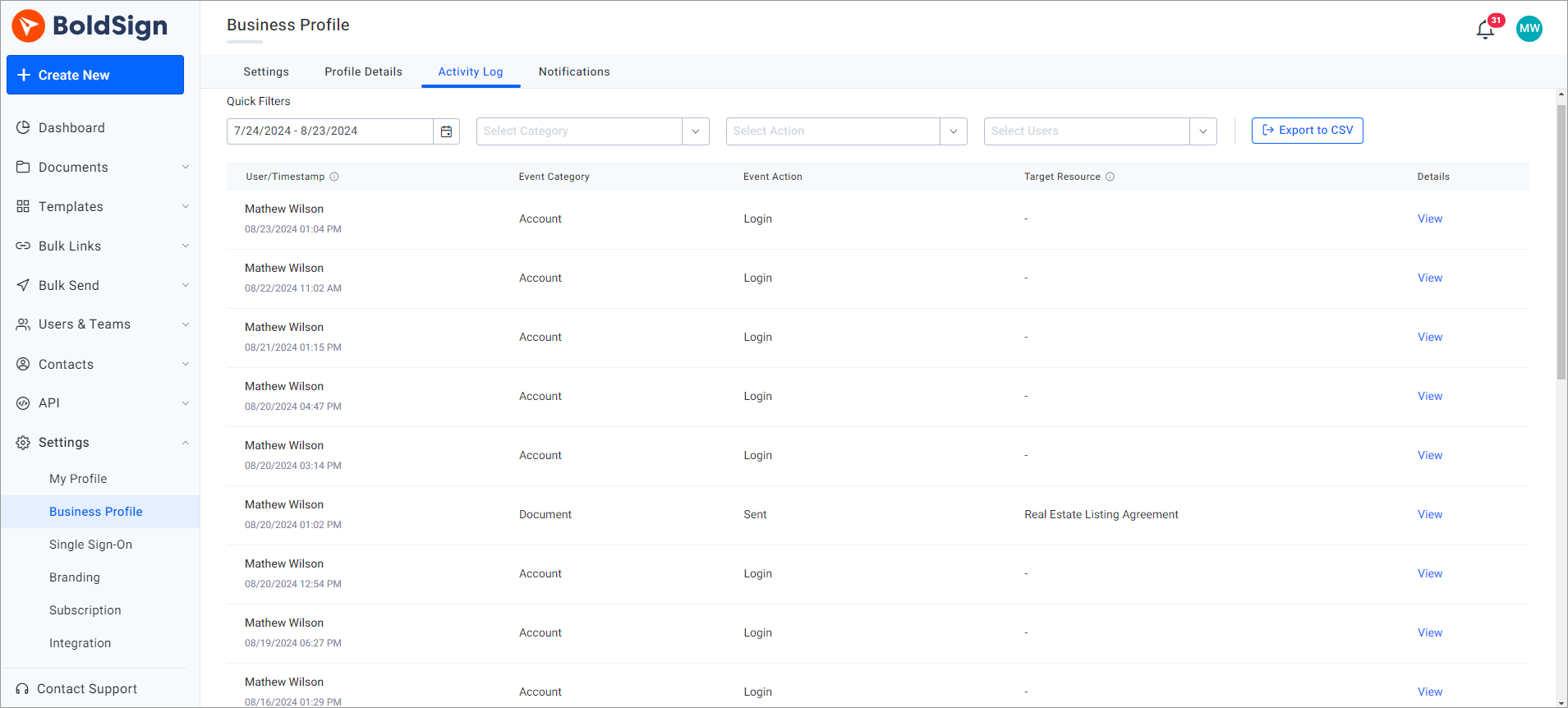 For instance, consider an HR manager overseeing a team of associates responsible for various tasks within their organization’s account. Manually tracking each individual’s activity can be time-consuming. The BoldSign activity log simplifies this process by enabling HR managers to monitor team activities in one place. They gain valuable insights into task completion rates and can identify user behavior patterns. This centralized visibility helps HR leads to manage their teams effectively without the need for constant check-ins with each associate.