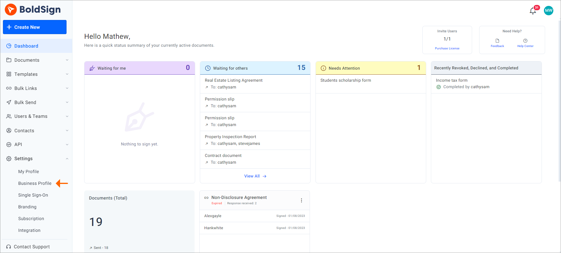 - Start by logging into your BoldSign account. You will be directed to the Dashboard page.