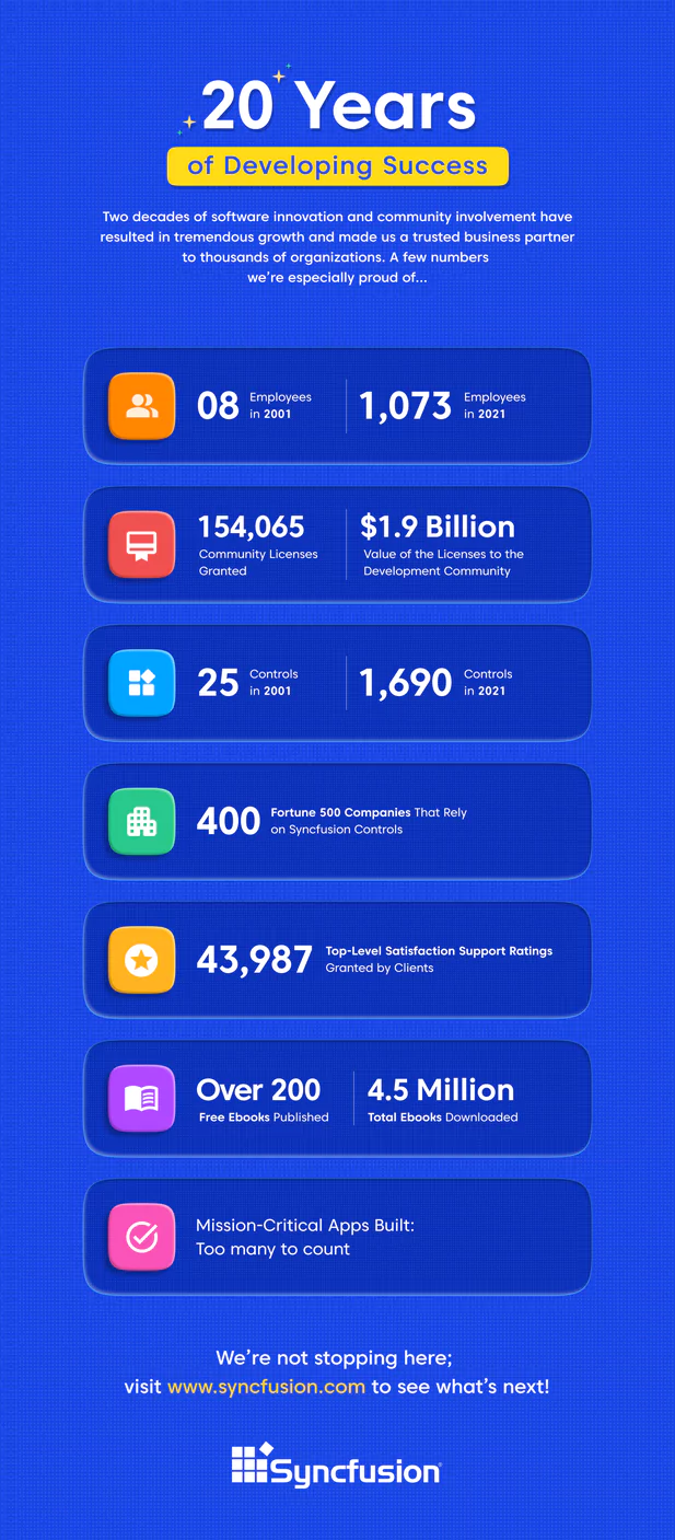 To learn more about Syncfusion’s 20-year history, refer to the company’s timeline, anniversary infographic, and blog about the founding of Syncfusion.